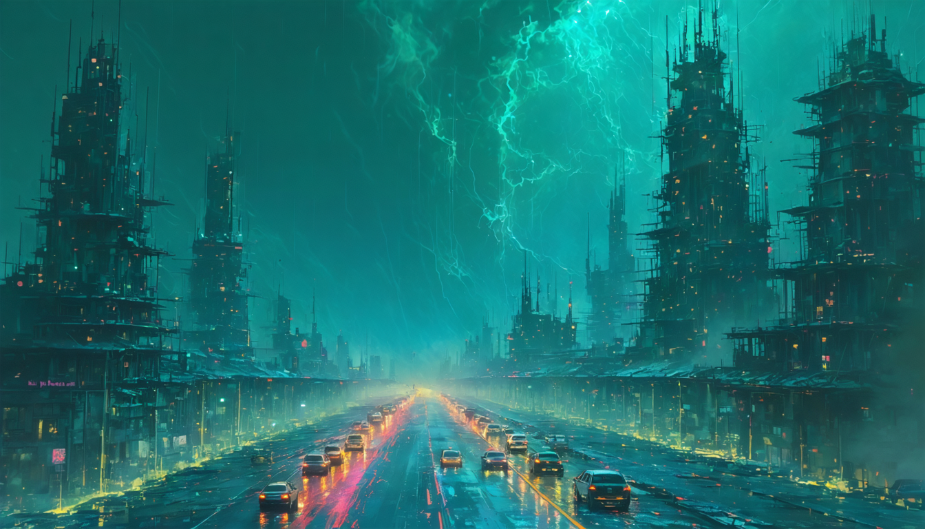 Electrified Echoes Artwork Text neon whispers hum steel spires pierce stormy veils city's heartbeat thrums artist Elias Voss